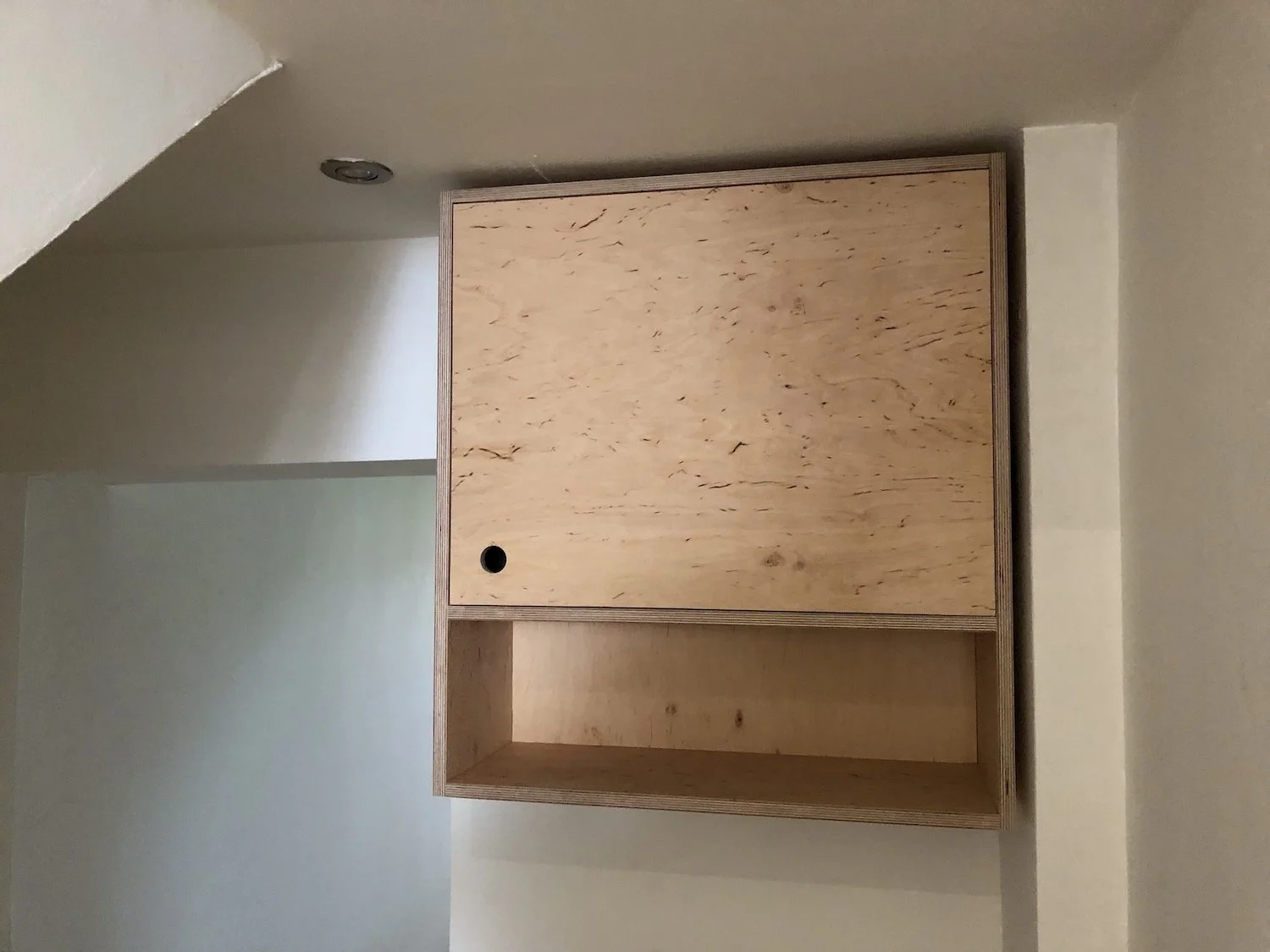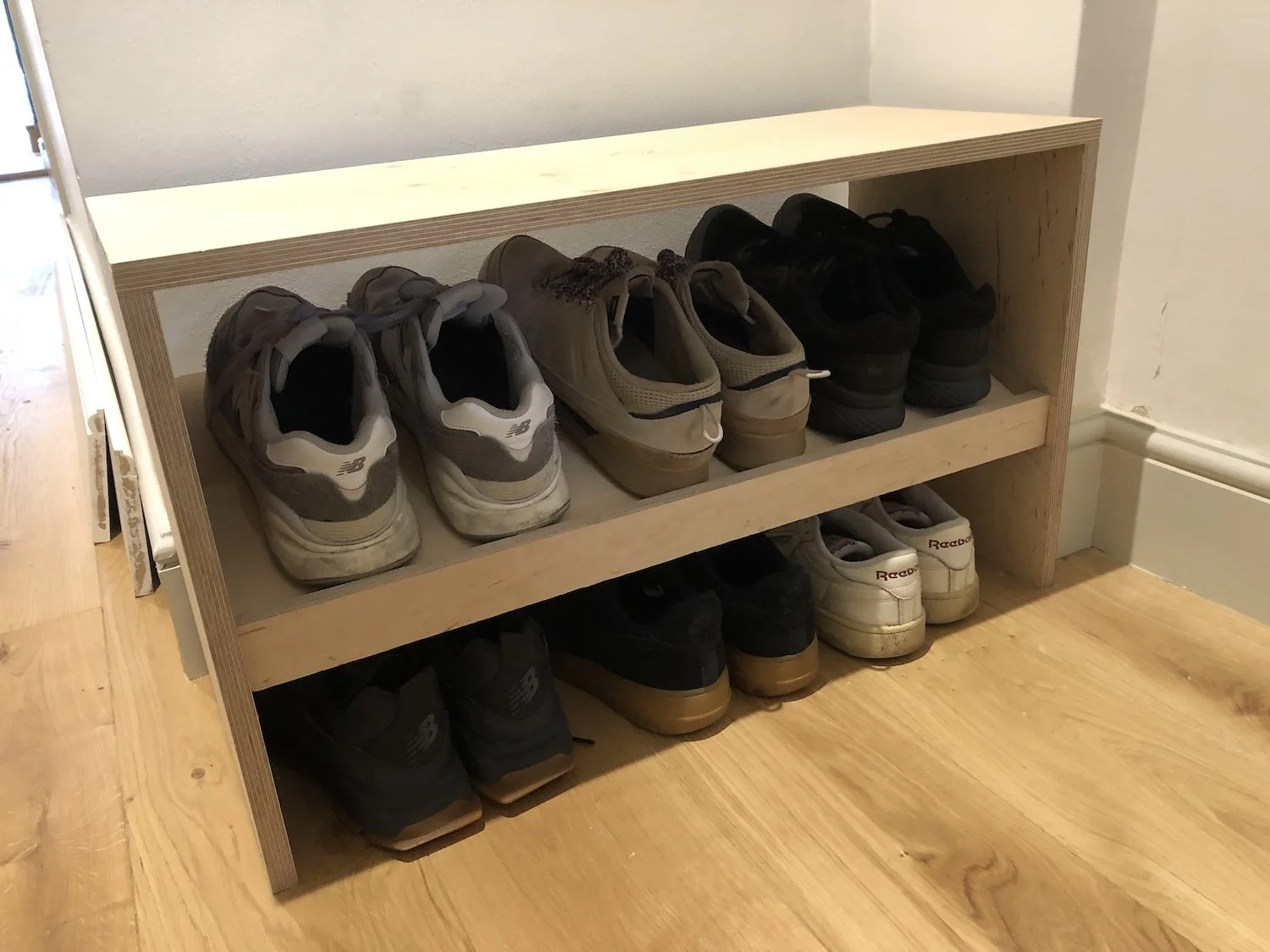 Removal & replacement of a clunky corridor cupboard. A new cabinet and shelf discreetly conceal a fuse box, whilst a bespoke shoe rack (doubling up as a bench) de-clutters an awkward corner with a clean and compact storage solution.